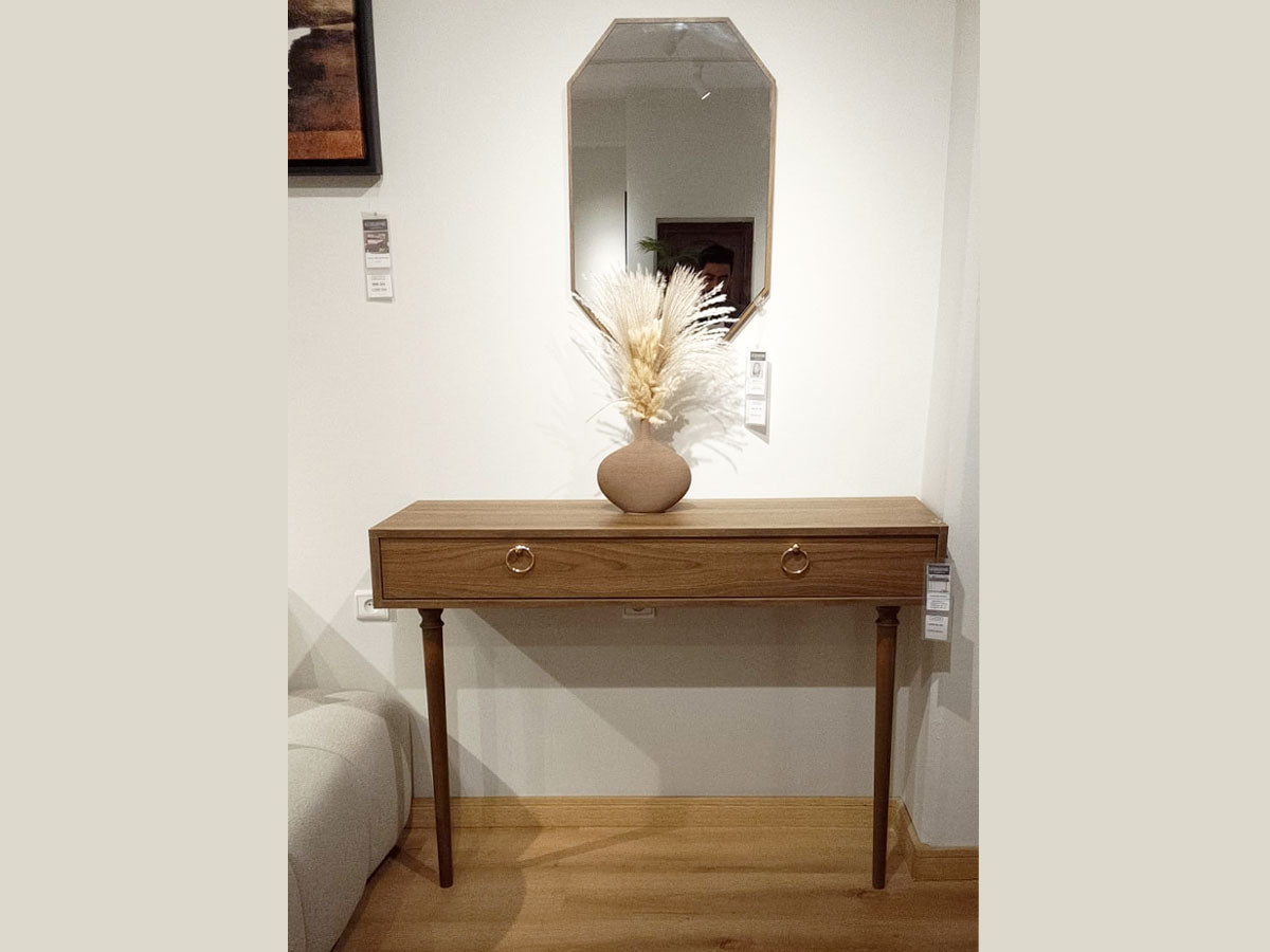 Sublimez votre séjour ou votre entrée avec l'ensemble Goldy. Ce duo raffiné allie la chaleur du bois effet noyer à l'éclat de finitions dorées pour un rendu contemporain et prestigieux.