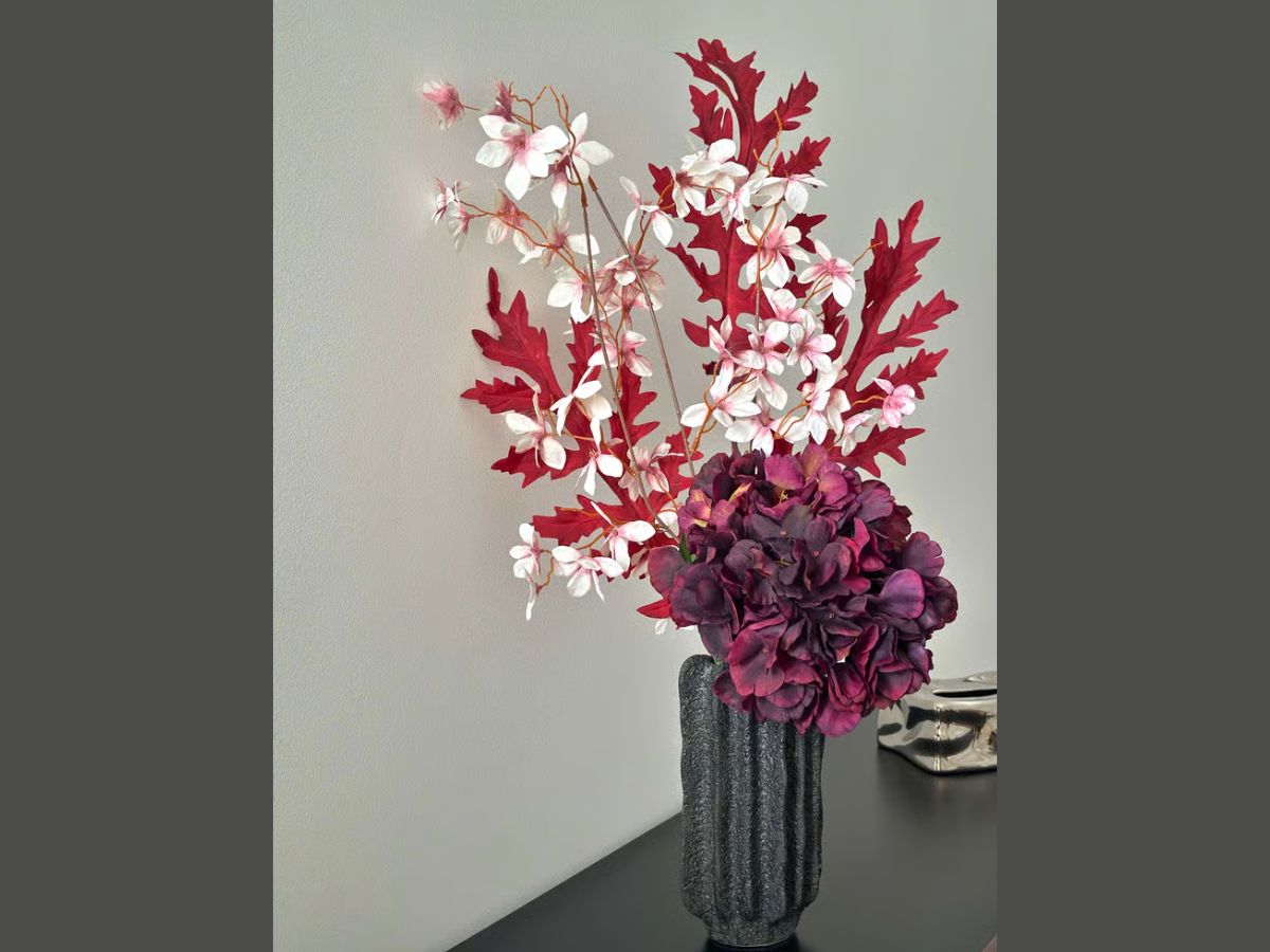 Apportez caractère et intensité à votre intérieur avec la composition Passion Florale, une création florale au design audacieux et sophistiqué. Ce bouquet associe avec harmonie des feuillages rouges profonds, des hortensias bordeaux et de délicates fleurs blanches aux nuances rosées, créant un contraste riche et élégant.