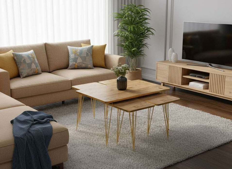 Ensemble de tables basse élégantes en bois effet marbre et structure métallique doré. Cet en ensemble est composé de 5 pièces.