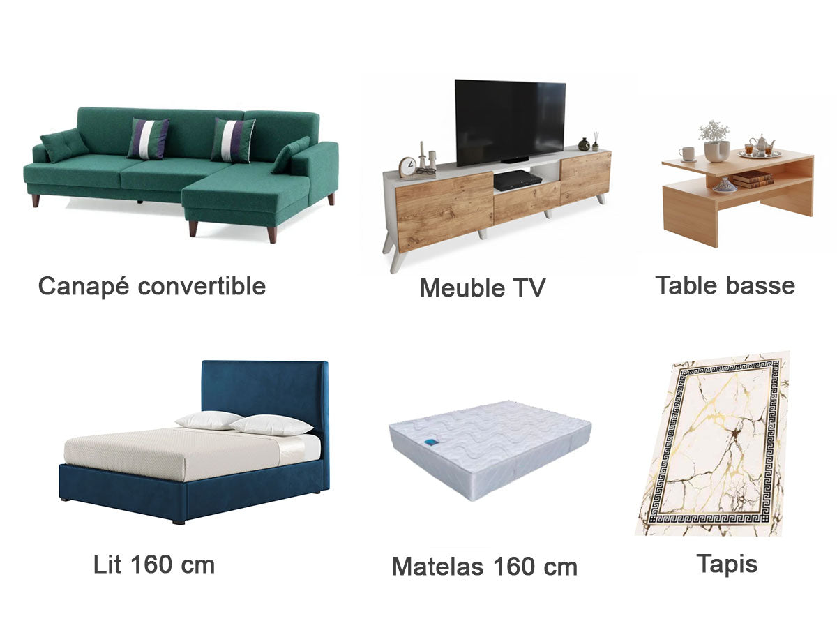 Canapé convertible en L + Lit 160 + Matelas + Tapis + Table basse + Meuble TV + 2 coussins gratuits
