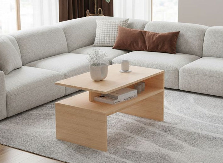 Salon complet : Une table basse élégante, un meuble TV fonctionnel et un tapis assorti.
