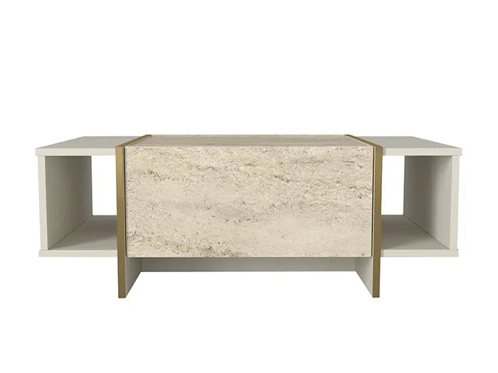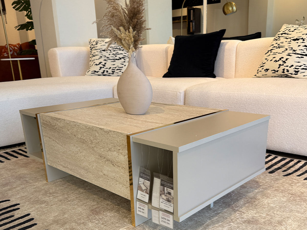 Table basse élégante en bois effet marbre Travertin avec des lignes dorées.
